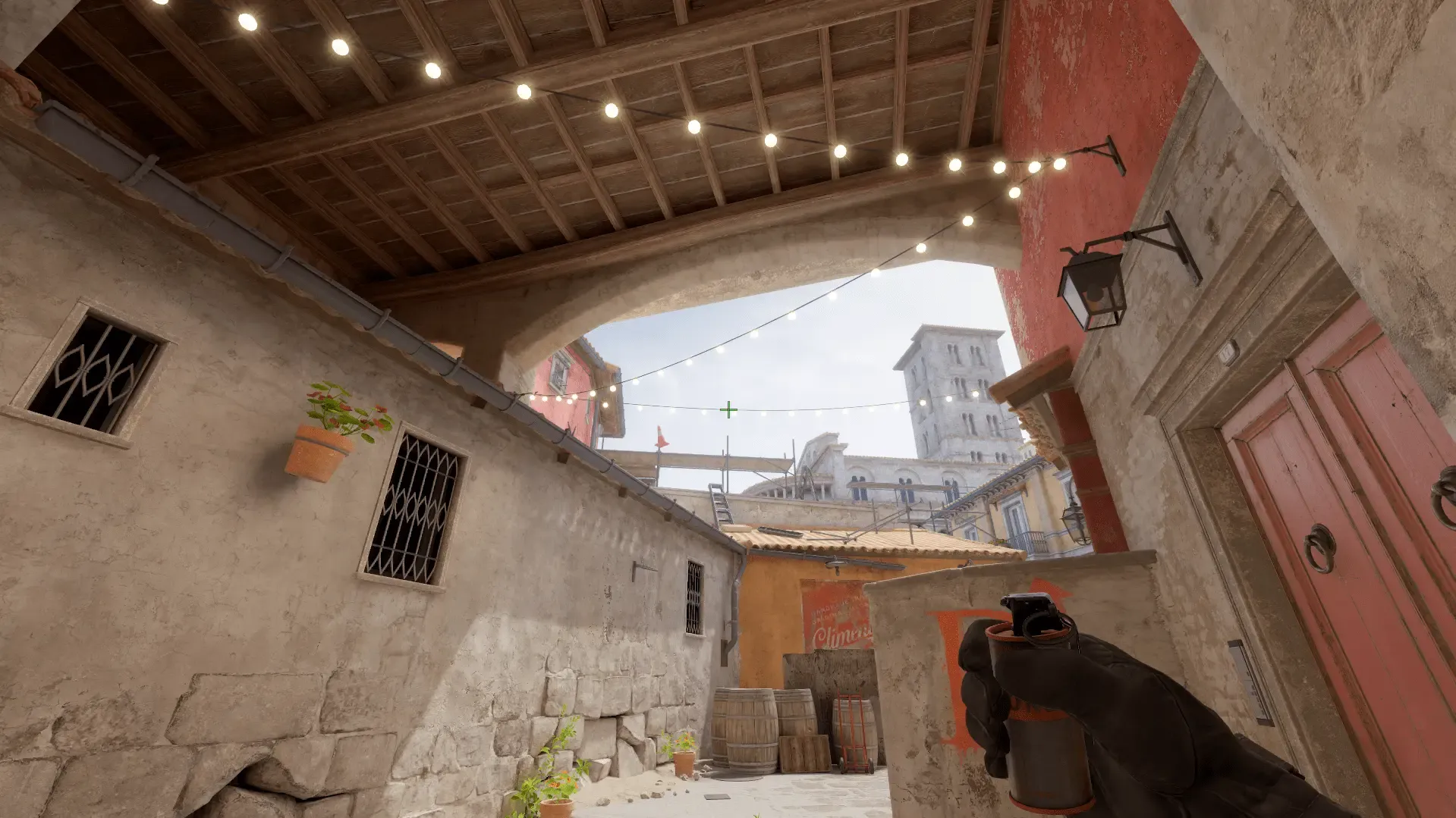 - Ставим прицел на конец металлической палки и отводим его вверх к проводу. Ориентируетесь на скриншот и кидайте дым