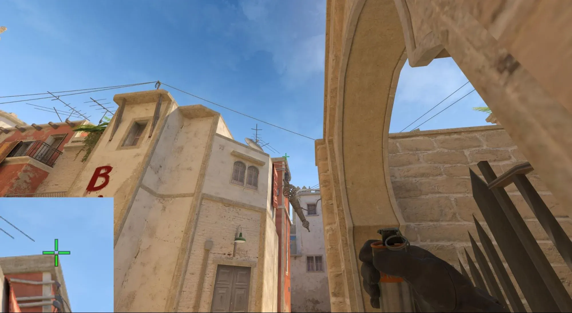 - Навести прицелом на край крыши как показано на скриншоте: