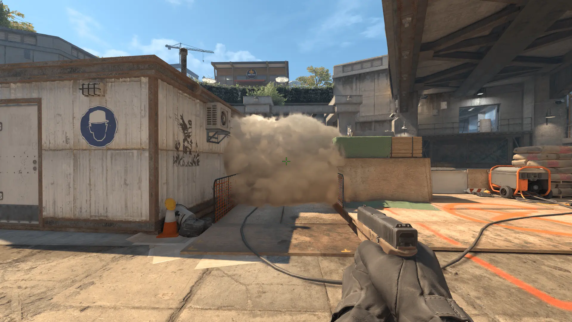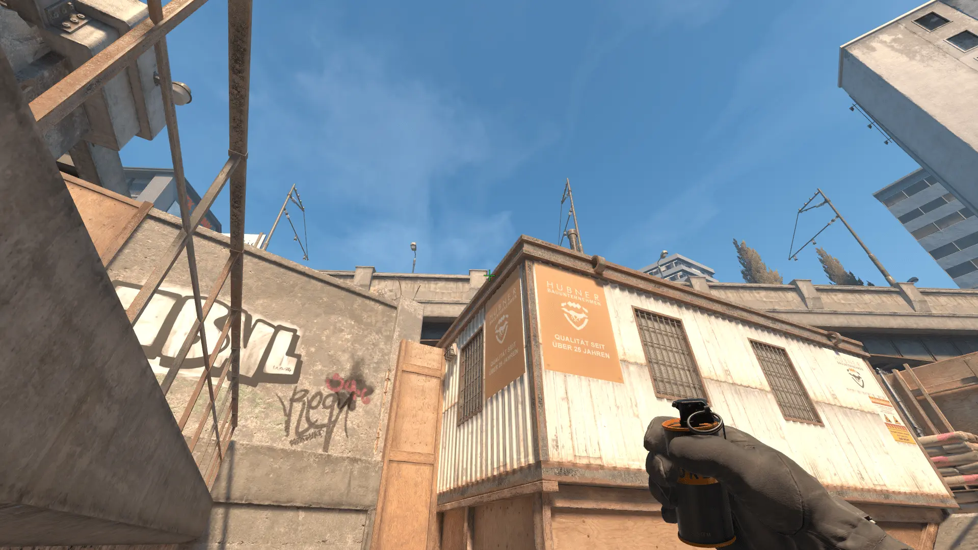 - Прицел ставим на угол между крышей будки и верхушкой моста и бросаем дым