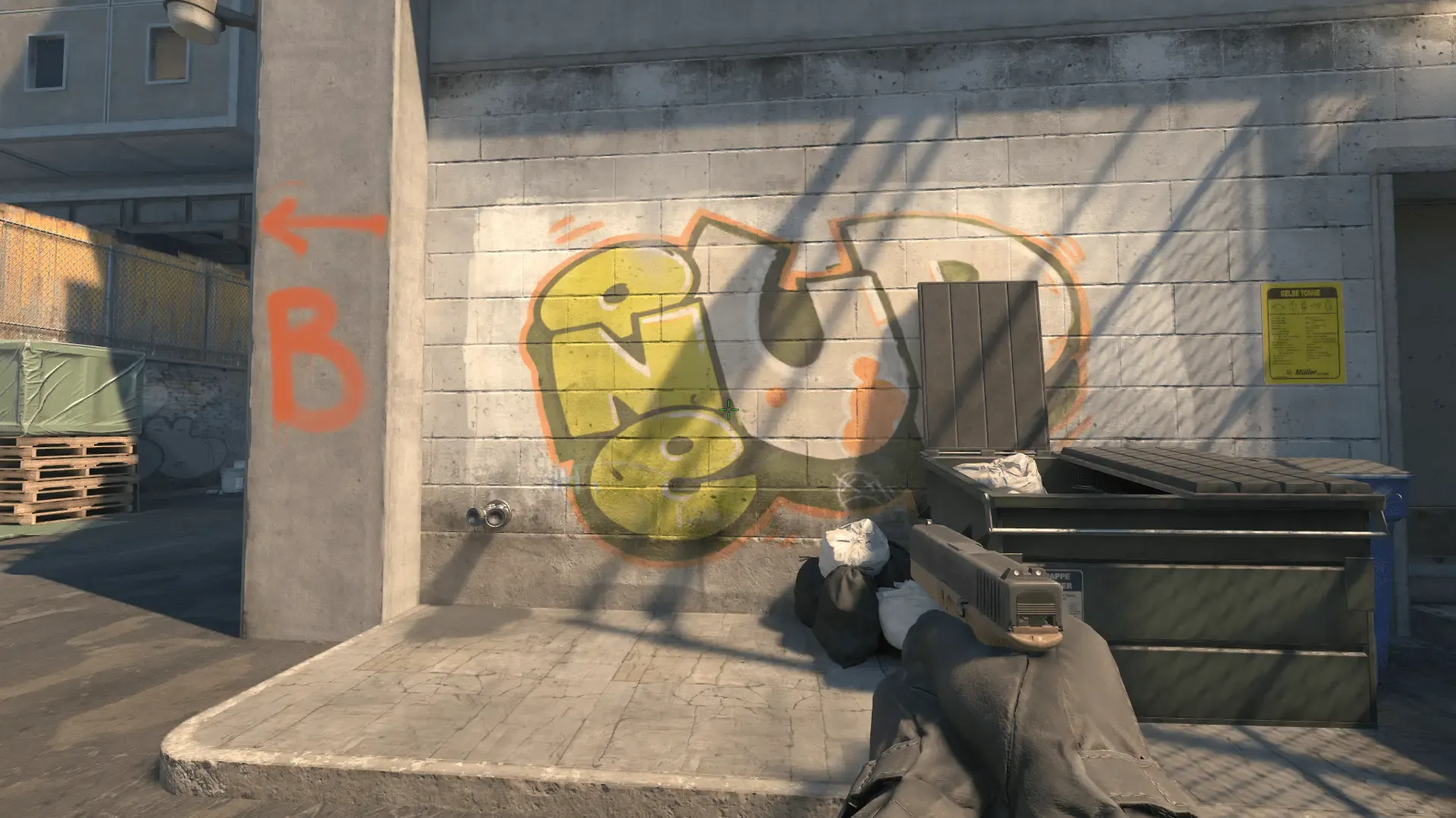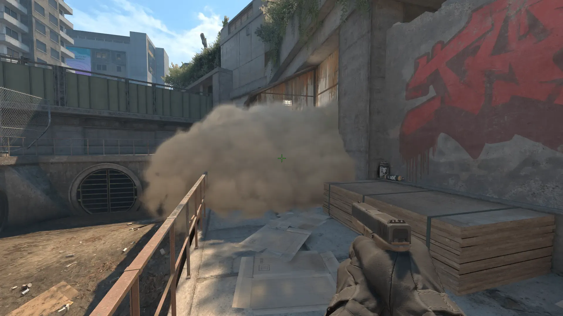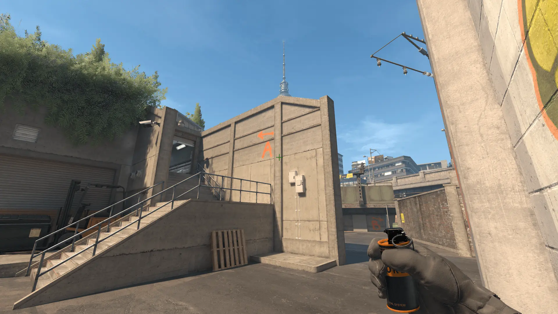 - Наводимся на горизонтальную линию и отводим прицел чуть левее, примерно так как показано на фото и бросаем смок с прыжком